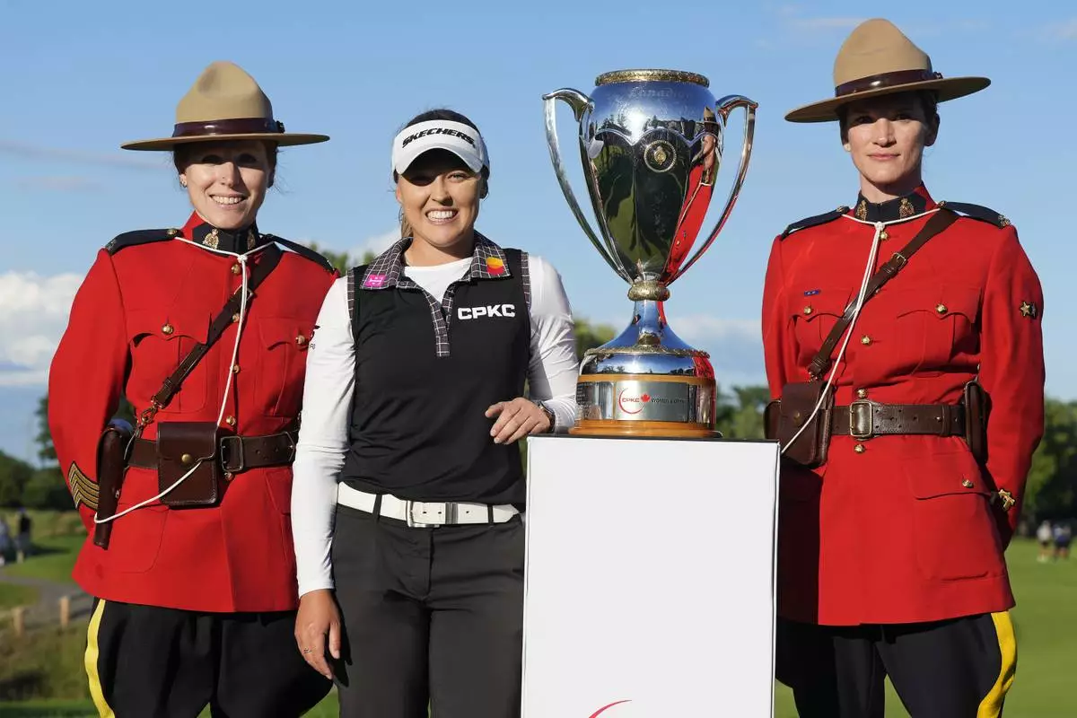 Brooke Henderson, of Canada, poses with the CPKC Championship Trophy alongside Royal Canadian Mounted Police officers after winning the Canadian Women's Open at Mississauga Golf and Country Club in Mississauga, Ontario, on Sunday, August 24, 2025. (Frank Gunn/The Canadian Press via AP)