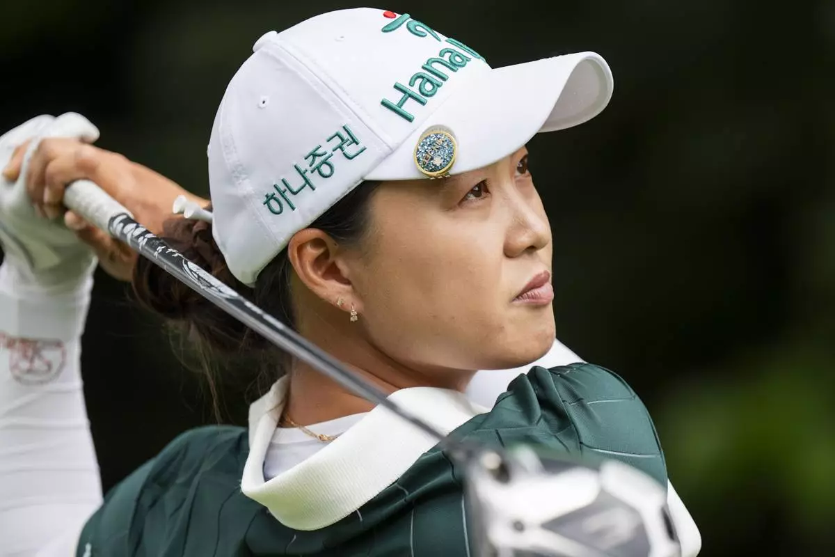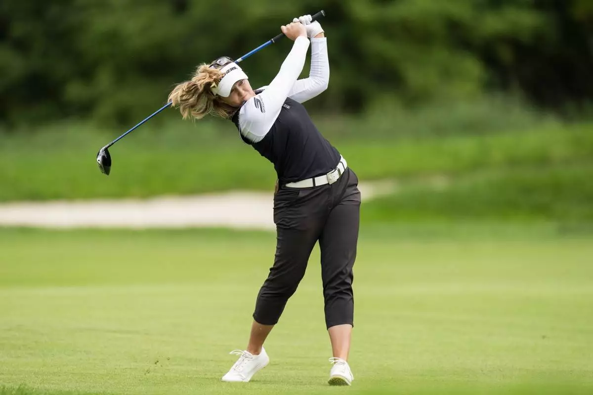 Minjee Lee, of Australia, tees off on the fifth hole during the fourth round of the CPKC Women's Open at the Mississauga Golf and Country Club in Mississauga, Ontario, Sunday, Aug. 24, 2025. (Thomas Skrlj/The Canadian Press via AP)