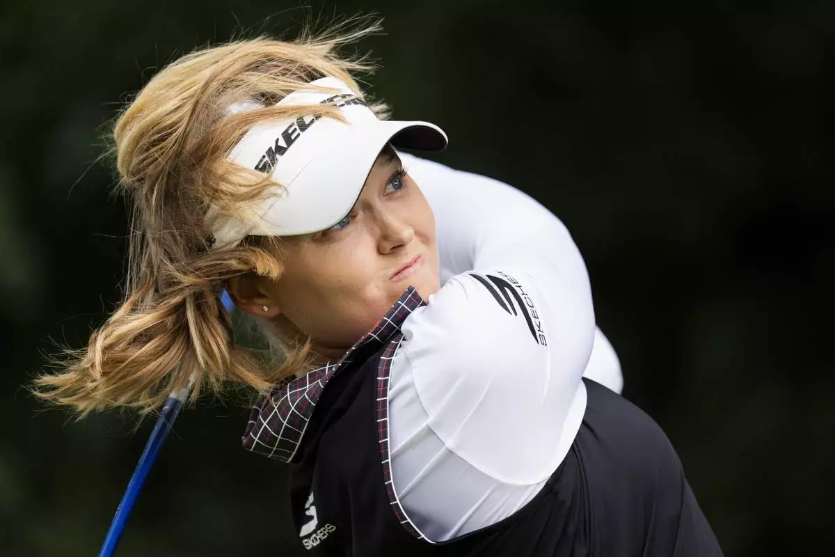 Canada's Brooke Henderson tees off on the fifth hole during the fourth round of the CPKC Women's Open at the Mississauga Golf and Country Club in Mississauga, Ontario, Sunday, Aug. 24, 2025. (Thomas Skrlj/The Canadian Press via AP)