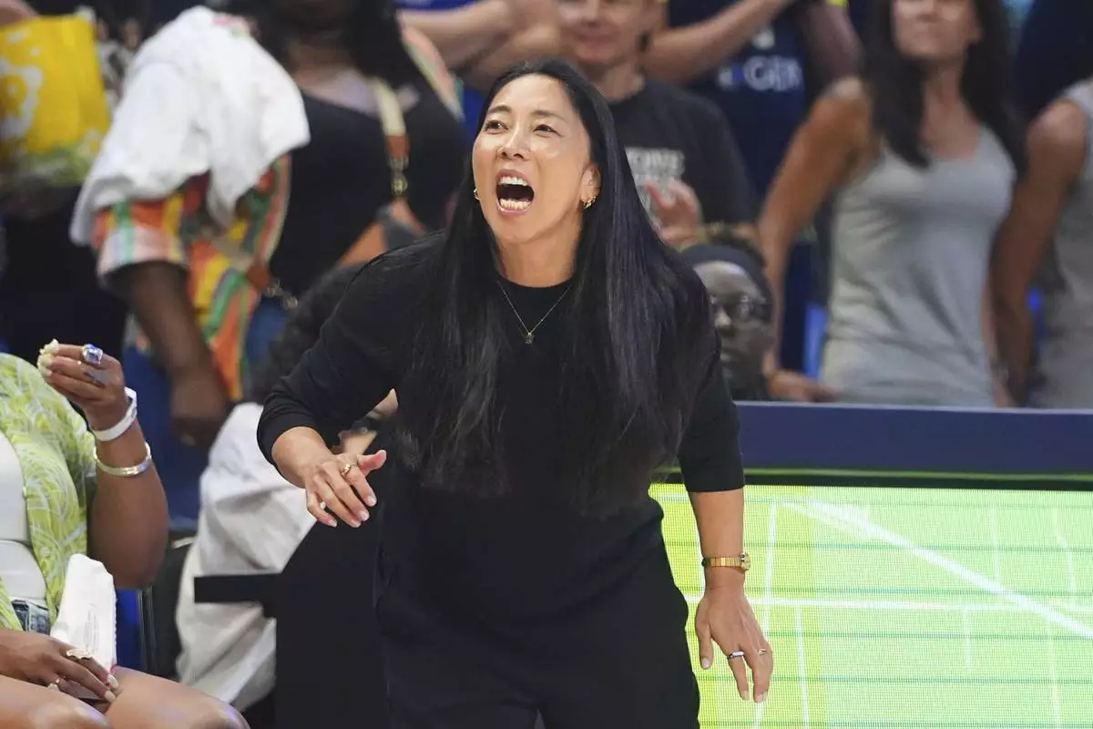 Golden State Valkyries head coach Natalie Nakase yells from the sideline during the first half of a WNBA basketball game against the Dallas Wings in Arlington, Texas, Sunday, Aug. 24, 2025. (AP Photo/LM Otero)