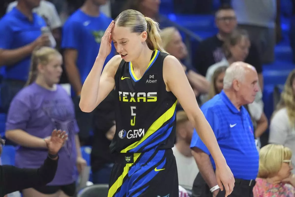 Dallas Wings guard Paige Bueckers reacts after a play during the first half of a WNBA basketball game against the Golden State Valkyries in Arlington, Texas, Sunday, Aug. 24, 2025. (AP Photo/LM Otero)