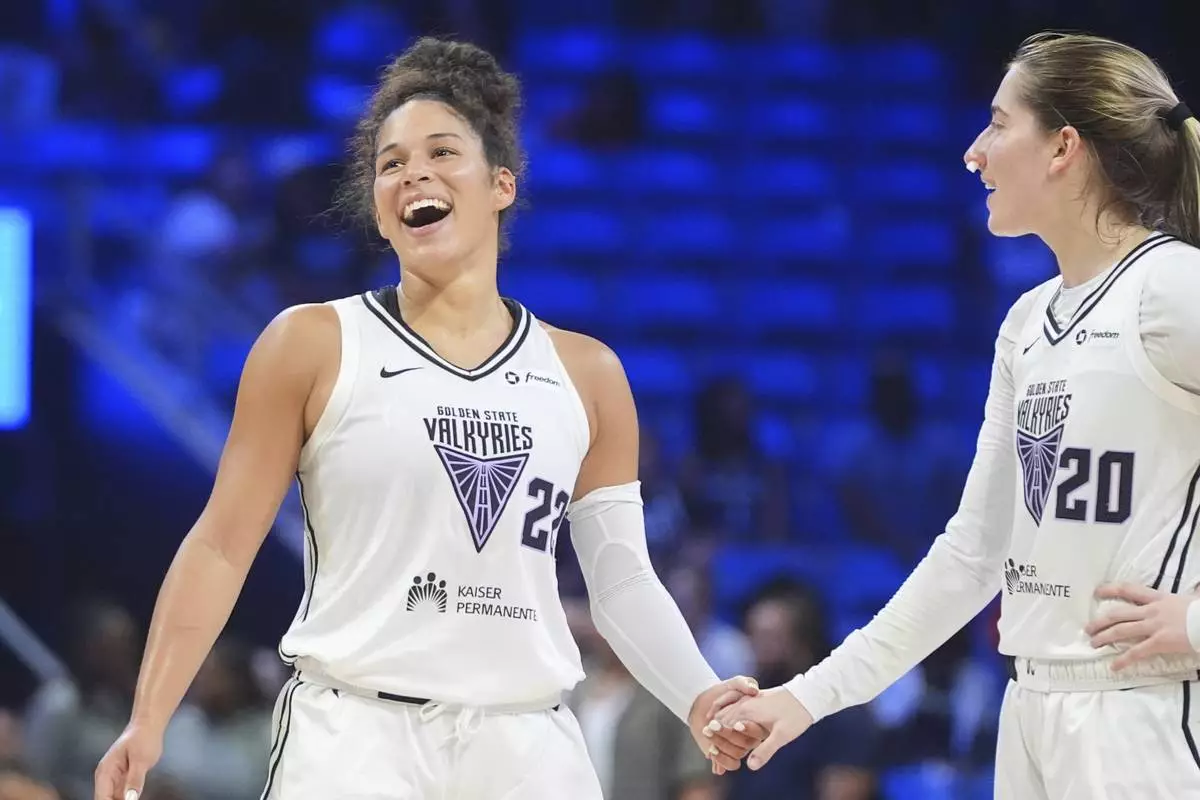 Golden State Valkyries guards Veronica Burton (22) and Kate Martin (20) smile during the second half of a WNBA basketball game against the Dallas Wings in Arlington, Texas, Sunday, Aug. 24, 2025. (AP Photo/LM Otero)