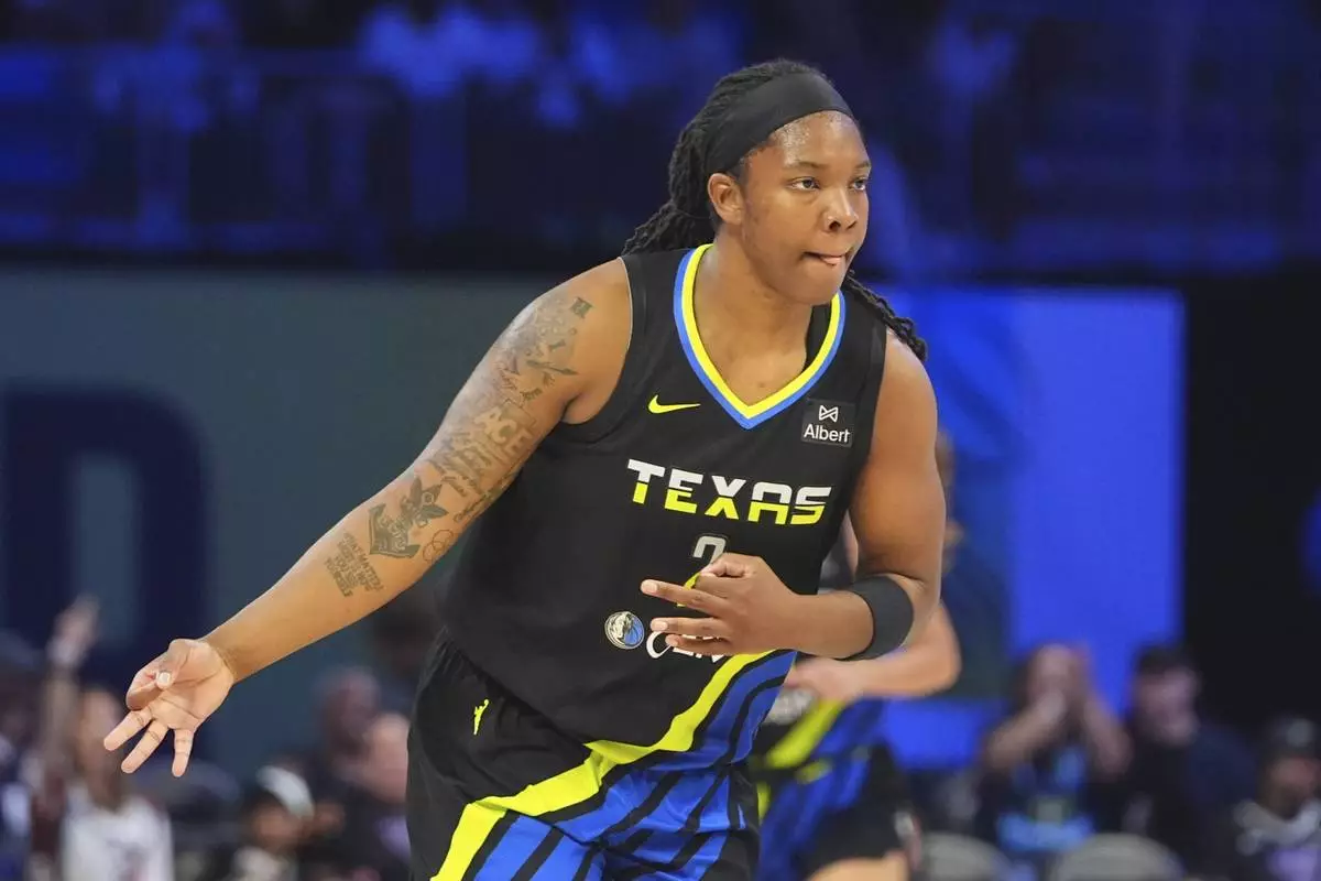 Dallas Wings forward Myisha Hines-Allen reacts after scoring a 3-point basket during the first half of a WNBA basketball against the Golden State Valkyries in Arlington, Texas, Sunday, Aug. 24, 2025. (AP Photo/LM Otero)