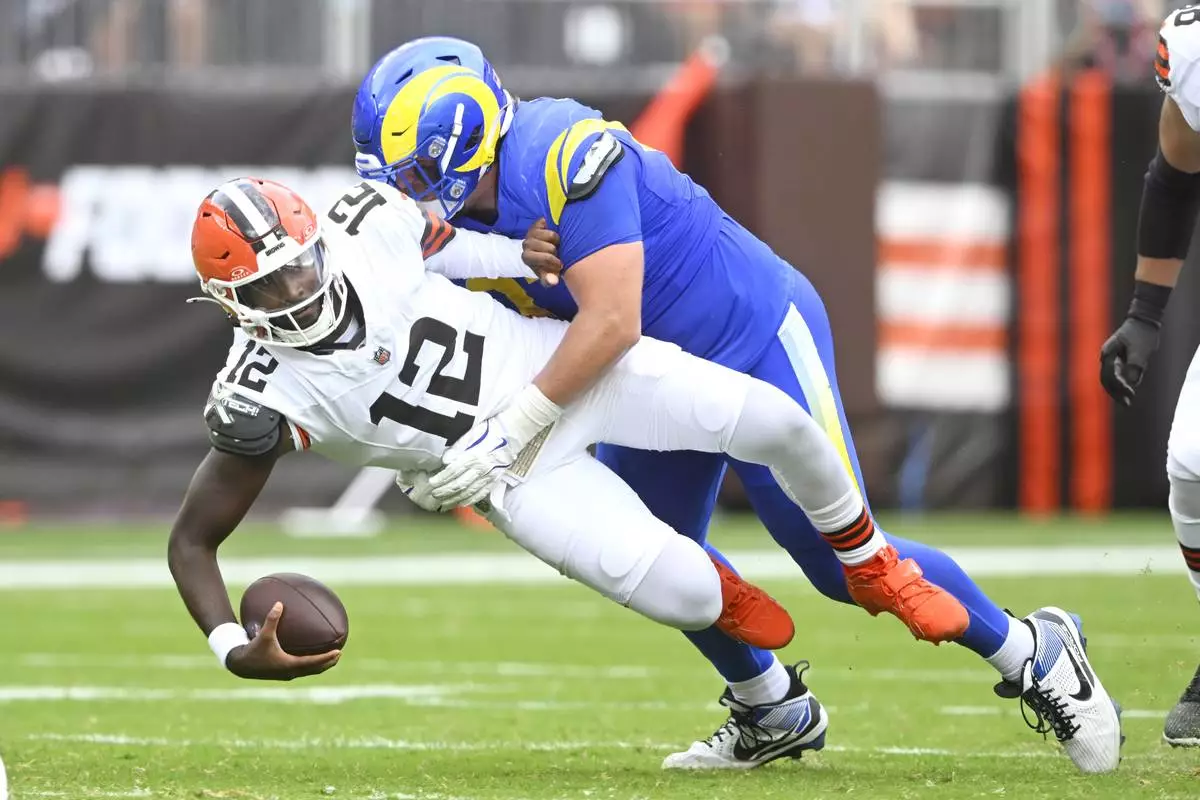 Los Angeles Rams defensive tackle Bill Norton (97) sacks Cleveland Browns quarterback Shedeur Sanders (12) in the second half of an NFL preseason football game Saturday, Aug. 23, 2025, in Cleveland. (AP Photo/David Richard)