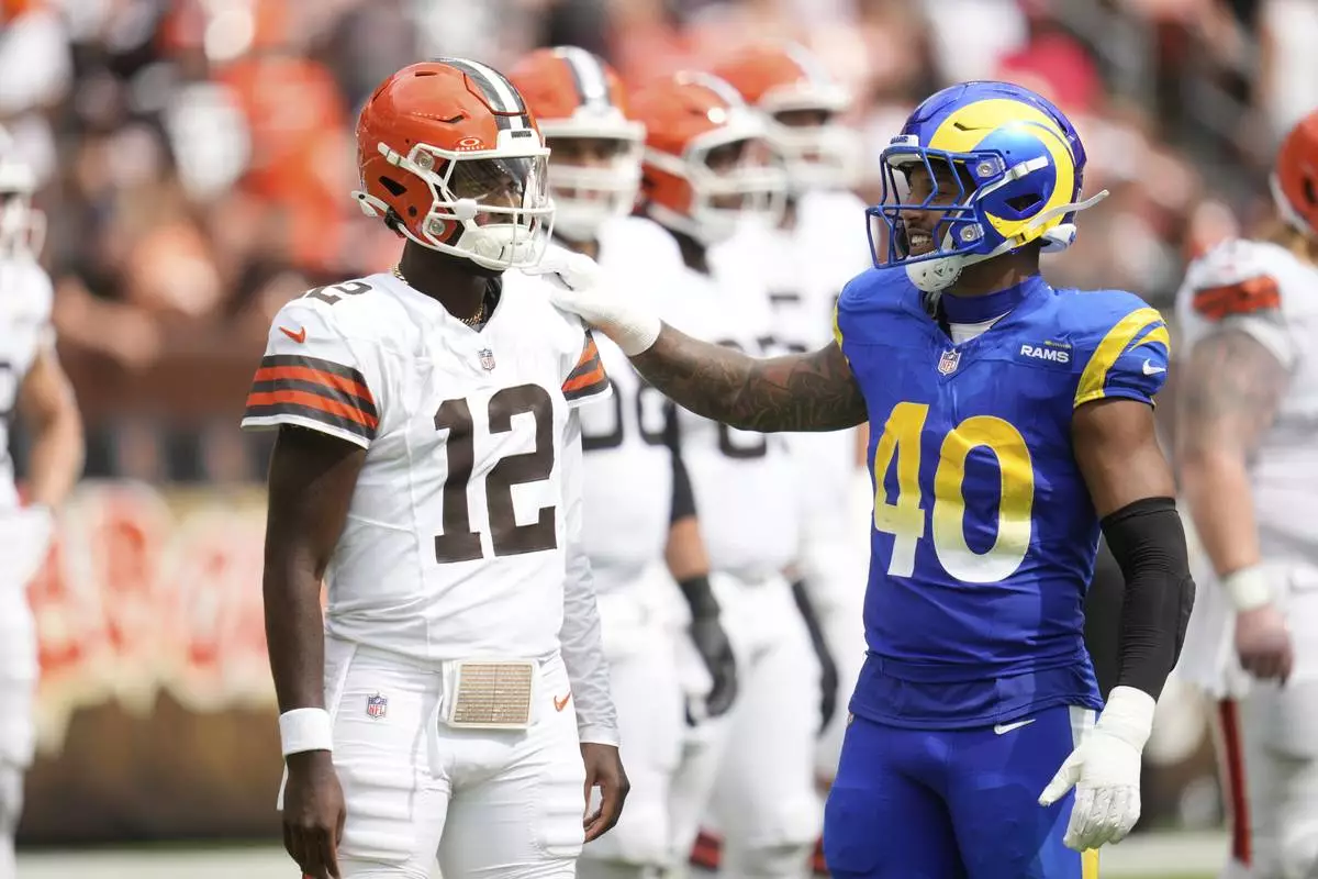 Cleveland Browns quarterback Shedeur Sanders (12) talks to Los Angeles Rams linebacker Tony Fields II (40) during the second half of an NFL preseason football game Saturday, Aug. 23, 2025, in Cleveland. (AP Photo/Sue Ogrocki)