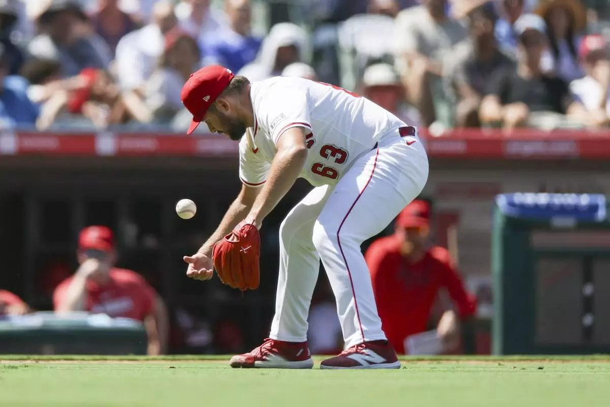 Los Angeles Angels relief pitcher Chase Silseth tries to field a ball during the sixth inning of a baseball game against the Chicago Cubs Sunday, Aug. 24, 2025, in Anaheim, Calif. (AP Photo/Eric Thayer)