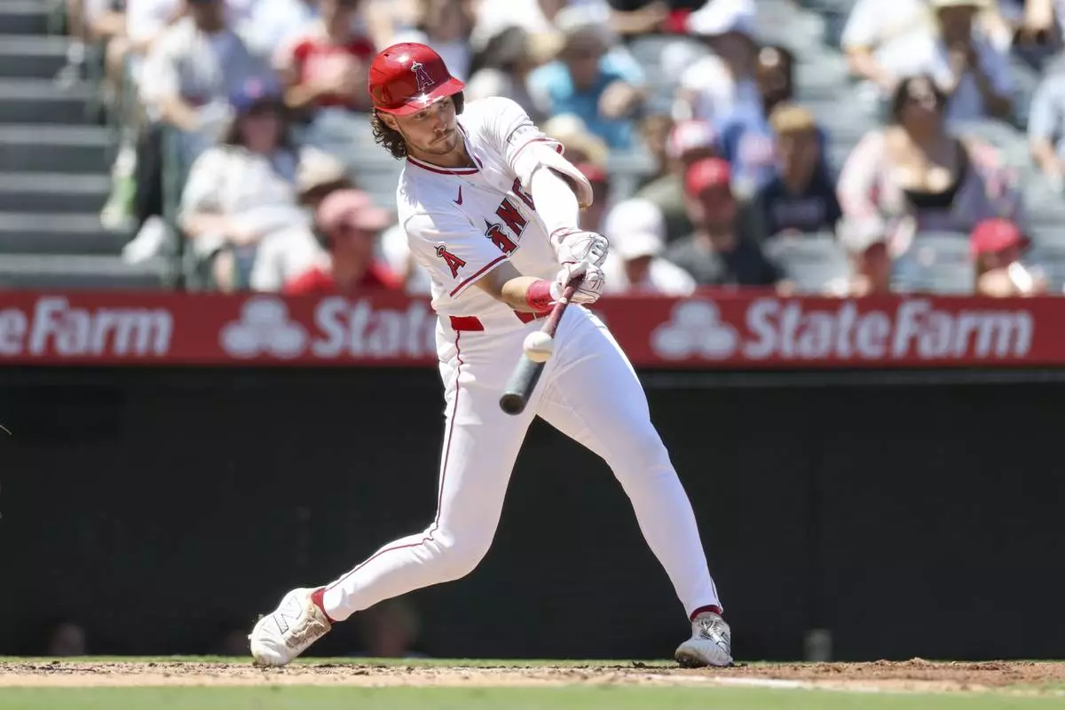 Los Angeles Angels' Bryce Teodosio makes contact with the ball during the third inning of a baseball game against the Chicago Cubs Sunday, Aug. 24, 2025, in Anaheim, Calif. (AP Photo/Eric Thayer)