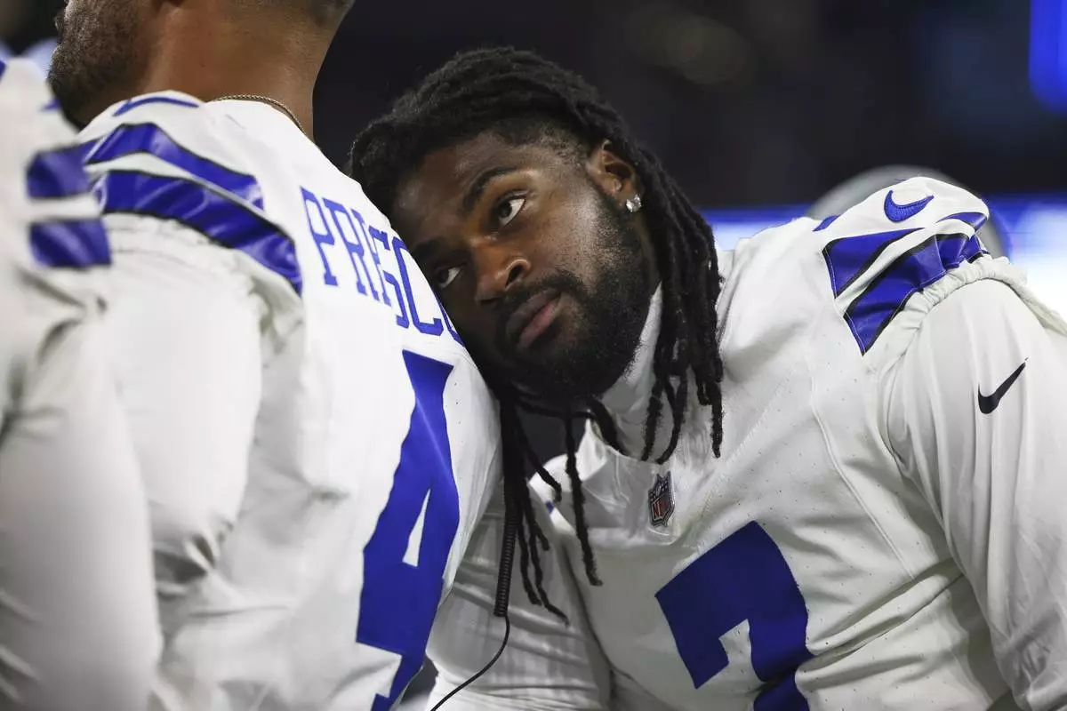 Dallas Cowboys cornerback Trevon Diggs, right, leans on quarterback Dak Prescott (4) as they talk on the sideline in the second half of a preseason NFL football game against the Baltimore Ravens Saturday, Aug. 16, 2025, in Arlington, Texas. (AP Photo/Gareth Patterson)