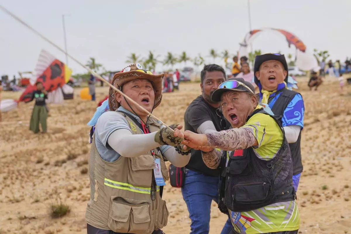Participants from China pull the string of their kite during the Colombo International Kite Festival in Colombo, Sri Lanka, Saturday, Aug. 23, 2025. (AP Photo/Eranga Jayawardena)