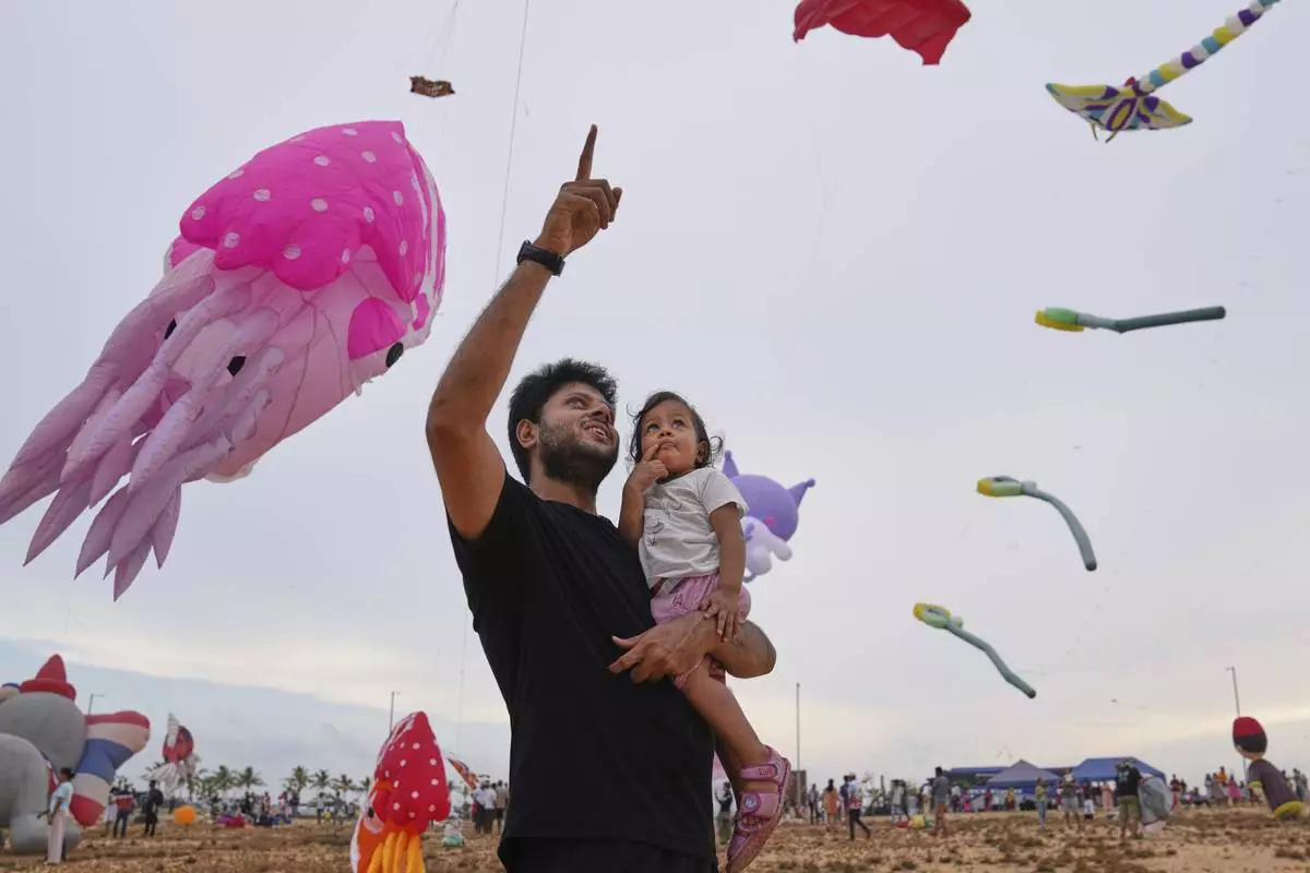 A man and his daughter attend the Colombo International Kite Festival in Colombo, Sri Lanka, Saturday, Aug. 23, 2025. (AP Photo/Eranga Jayawardena)