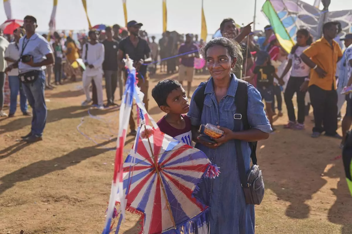 A Sri Lankan boy, accompanied by his mother, waits to fly his kite at the Colombo International Kite Festival in Colombo, Sri Lanka, Sunday, Aug. 24, 2025. (AP Photo/Eranga Jayawardena)