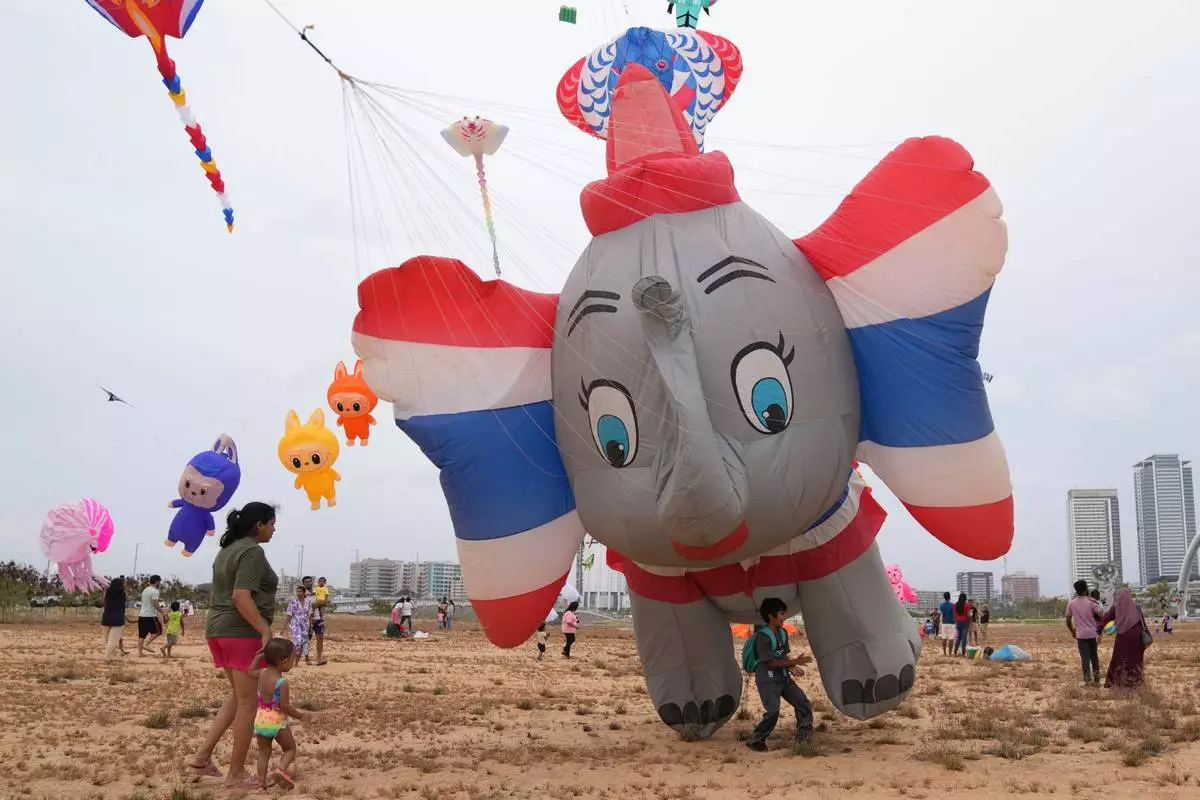 An elephant-shaped kite takes flight at the Colombo International Kite Festival in Colombo, Sri Lanka, Saturday, Aug. 23, 2025. (AP Photo/Eranga Jayawardena)