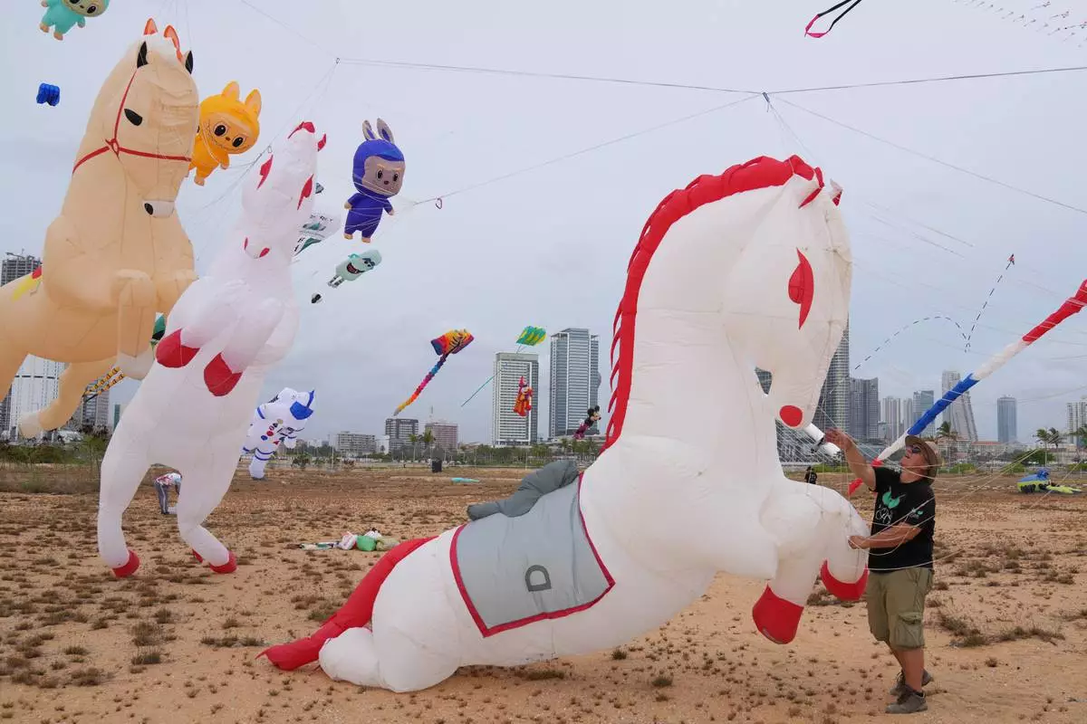 A participant from France prepares to fly his horse-shaped kite during the Colombo International Kite Festival in Colombo, Sri Lanka, Saturday, Aug. 23, 2025. (AP Photo/Eranga Jayawardena)