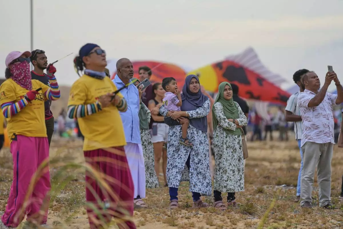 A Muslim family watches kite flyers perform during the Colombo International Kite Festival in Colombo, Sri Lanka, Saturday, Aug. 23, 2025. (AP Photo/Eranga Jayawardena)