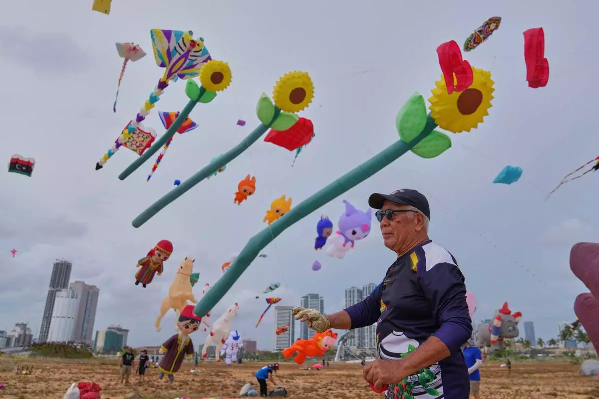 A participant from Malaysia flies kites during the Colombo International Kite Festival in Colombo, Sri Lanka, Saturday, Aug. 23, 2025. (AP Photo/Eranga Jayawardena)