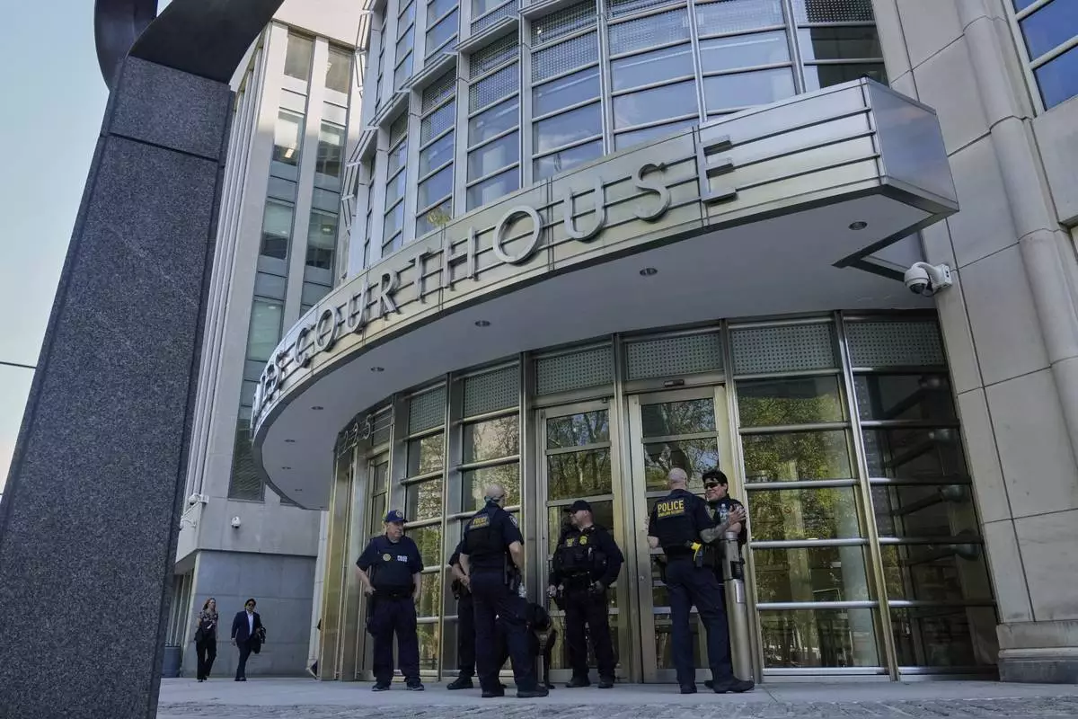 A group of Department of Homeland Security Police stand outside Federal court in the Brooklyn borough of New York, Monday, Aug. 25, 2025. (AP Photo/Richard Drew)