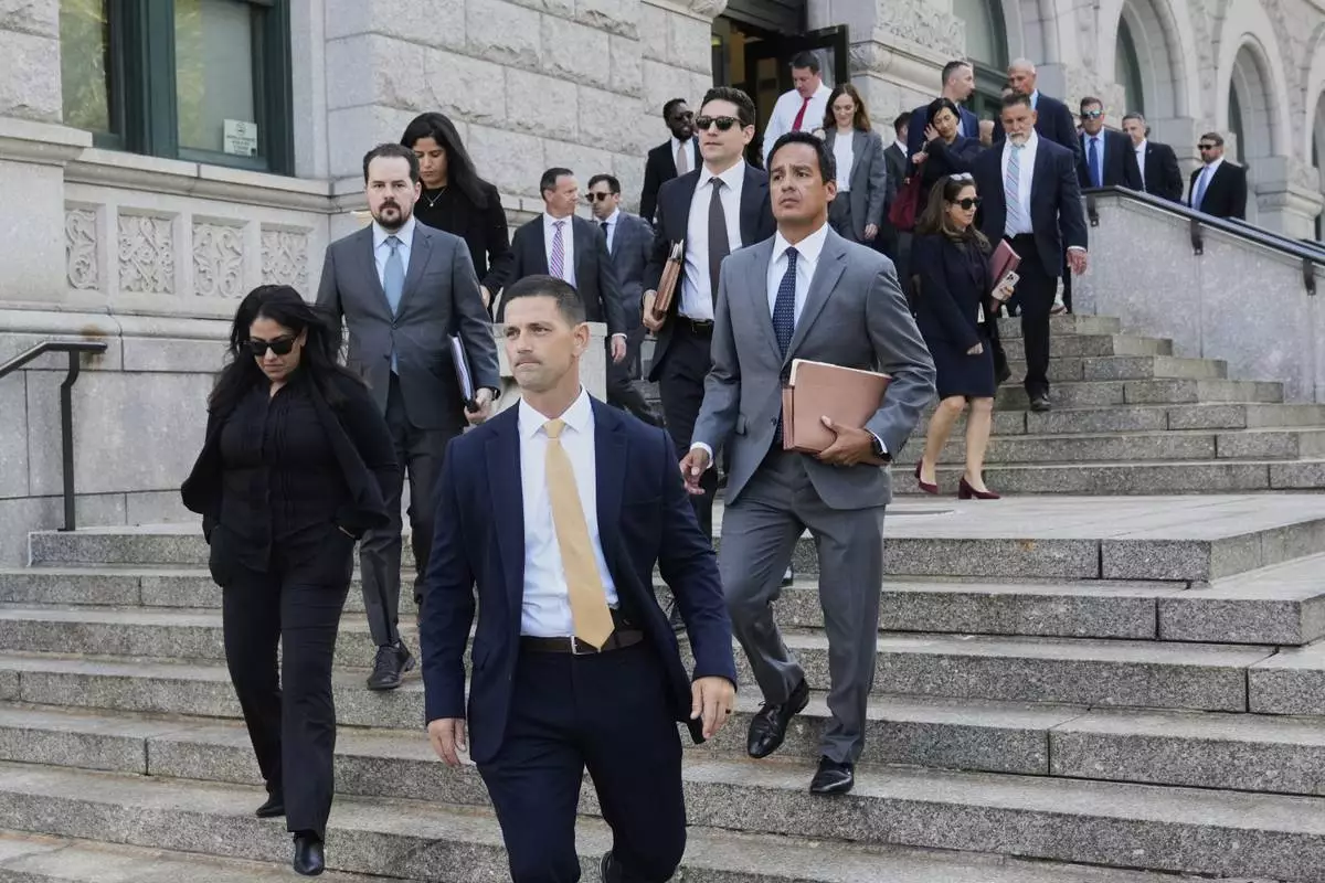 A group of people from the U.S. Attorney's office walk to Federal court in the Brooklyn borough of New York, Monday, Aug. 25, 2025. (AP Photo/Richard Drew)
