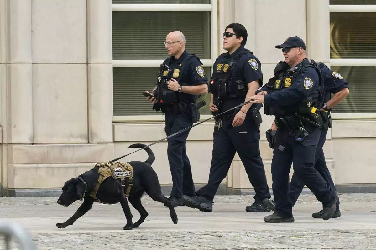 Department of Homeland Security Police and their dog patrol outside Federal court in the Brooklyn borough of New York, Monday, Aug. 25, 2025. (AP Photo/Richard Drew)