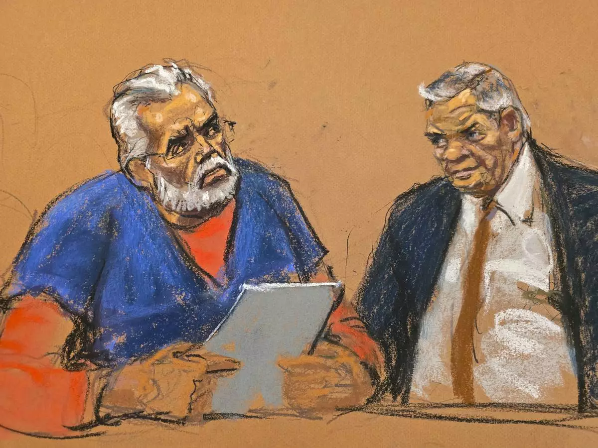 "El Mayo" Zambada speaks to Judge Brian Cogan (not pictured) in Brooklyn federal court, as his defense attorney Frank Perez looks on, Monday, Aug. 25, 2025, in New York. (Jane Rosenberg via AP)