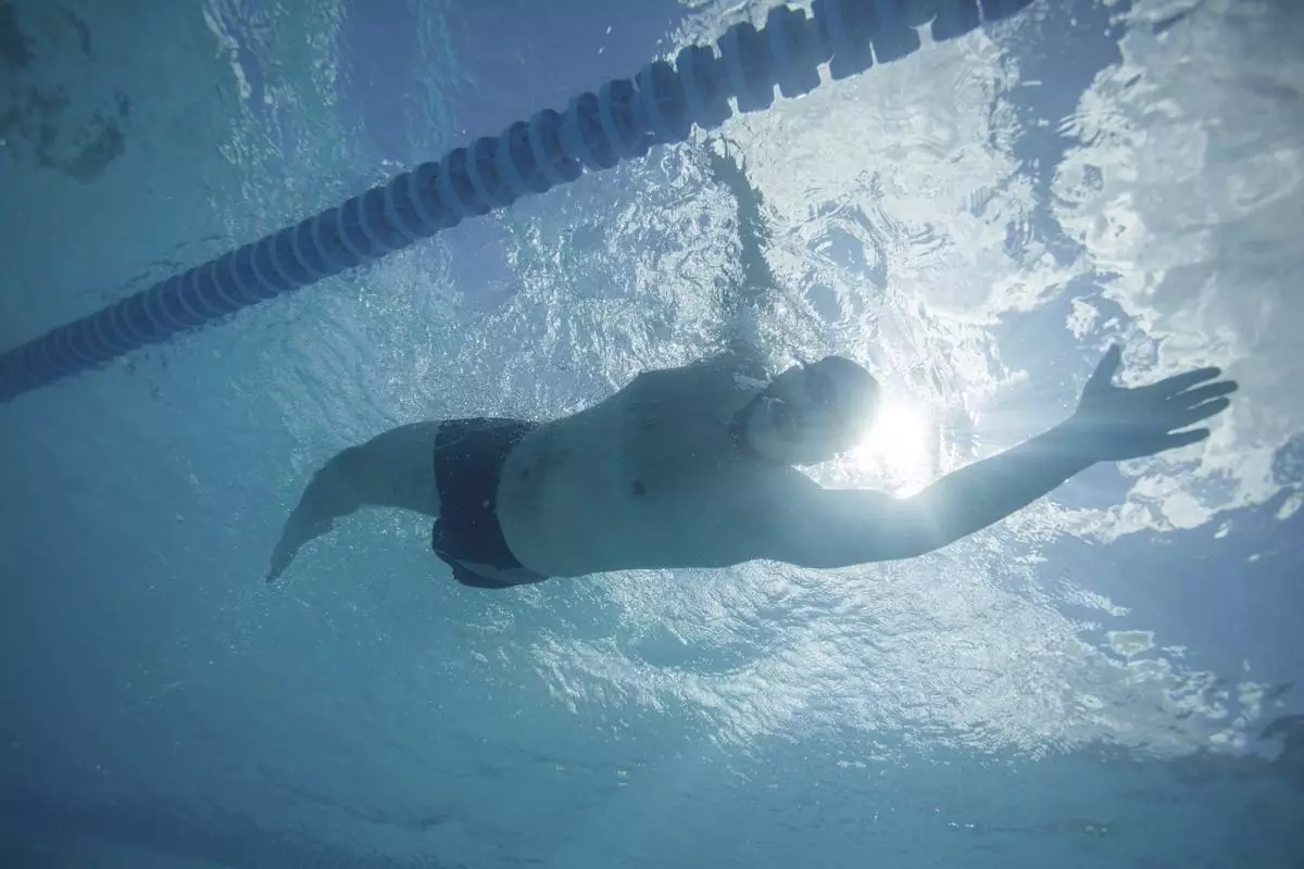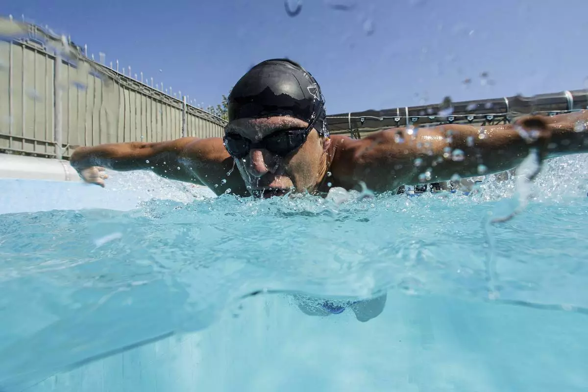 Ukrainian war veteran Oleksandr Dashko trains in a pool for an upcoming 6.5km swimming race across the Bosporus Strait, in Kyiv, Ukraine, Tuesday, Aug. 12, 2025. (AP Photo/Evgeniy Maloletka)