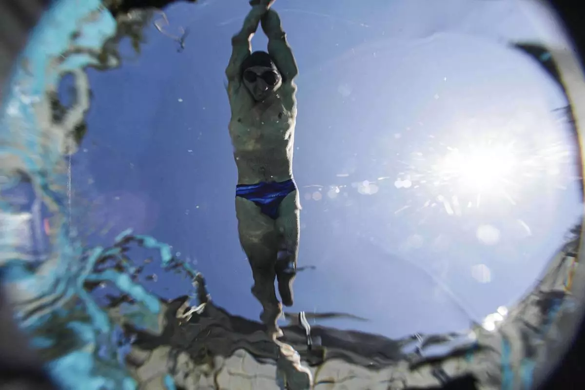 Ukrainian war veteran Pavlo Tovstyk jumps in a pool in Kyiv, Ukraine, Saturday, Aug. 16, 2025, during a training session to compete in a 6.5km swimming race across the Bosporus Strait. (AP Photo/Evgeniy Maloletka)