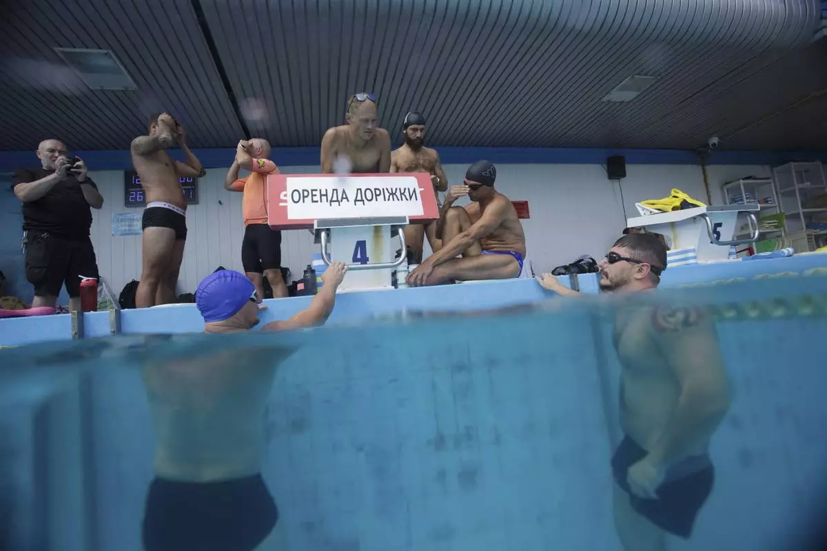 Ukrainian war veteran Oleh Tserkovnyi trains in a pool in Kyiv, Ukraine, Tuesday, Aug. 12, 2025, for the upcoming 6.5km swimming race across the Bosporus Strait. (AP Photo/Evgeniy Maloletka)