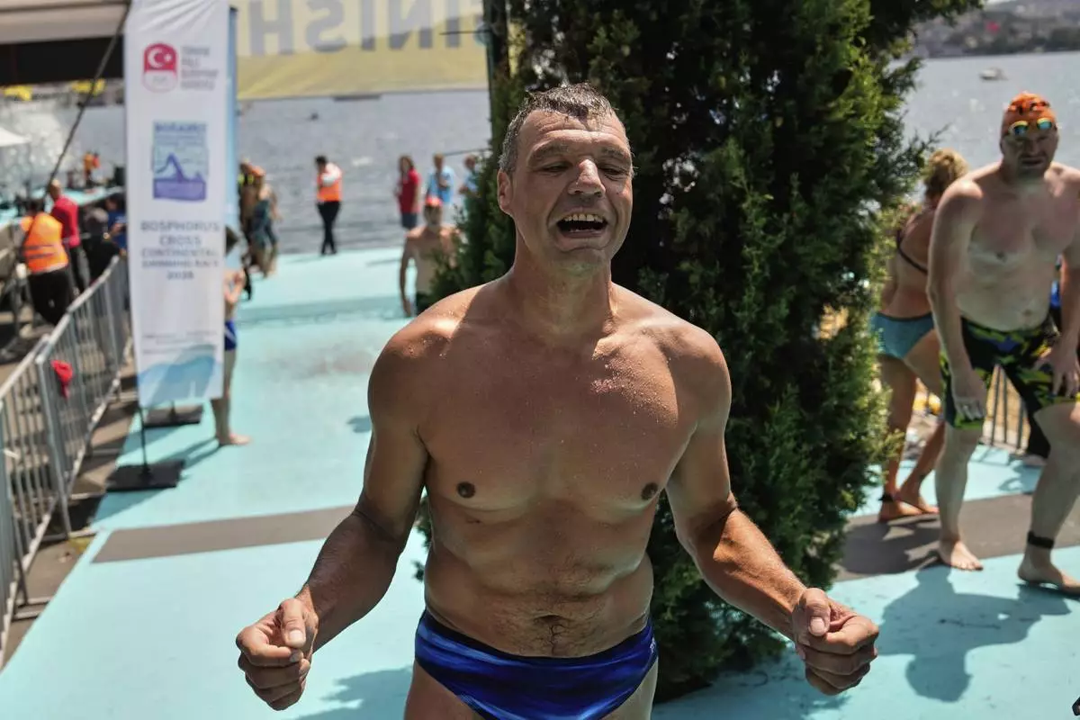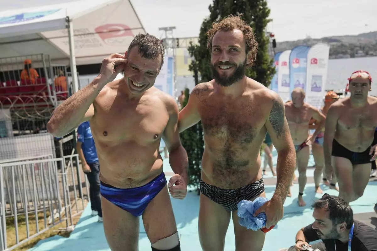 Ukrainian war veteran Oleksandr Dashko crosses the finish line during a 6.5km swimming race across the Bosporus Strait, from the Asian side to the European side, in Istanbul, Turkey, Sunday, Aug. 24, 2025. (AP Photo/Khalil Hamra)