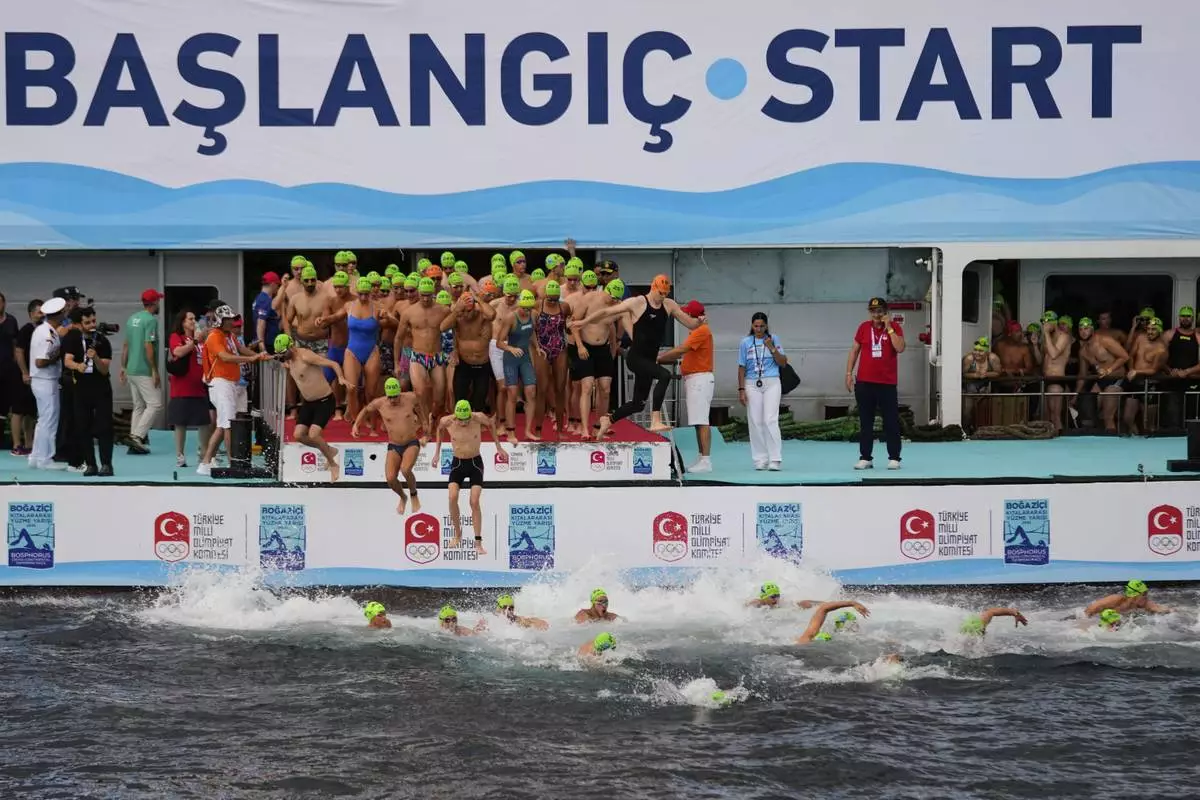 Competitors jump into the water at the start of a 6.5km swimming race across the Bosporus Strait, from the Asian side to the European side, in Istanbul, Turkey, Sunday, Aug. 24, 2025. (AP Photo/Khalil Hamra)