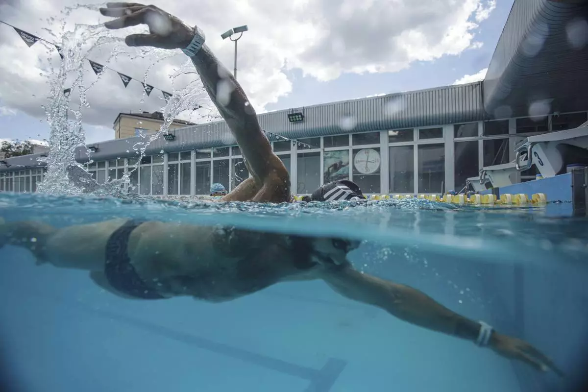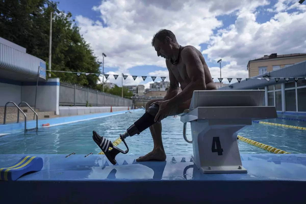 Ukrainian war veteran Pavlo Tovstyk trains in a pool in Kyiv, Ukraine, Saturday, Aug. 16, 2025, during a training session to compete in a 6.5km swimming race across the Bosporus Strai. (AP Photo/Evgeniy Maloletka)