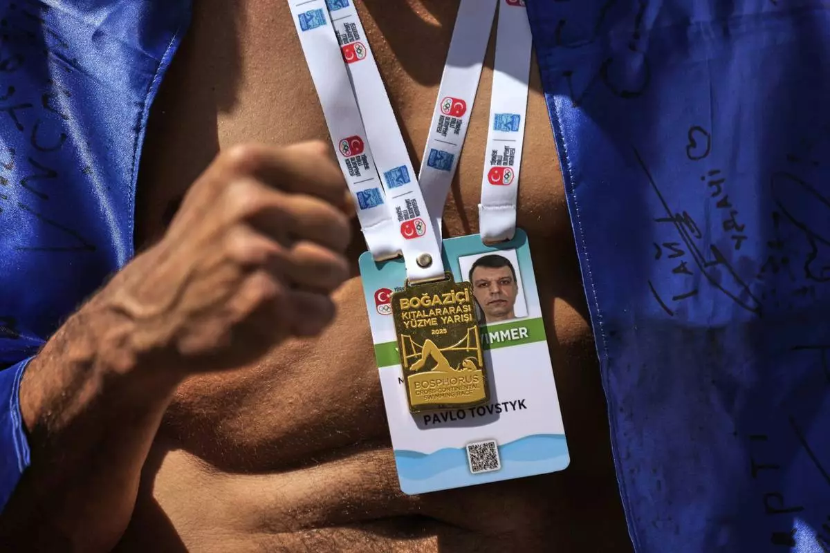 Ukrainian war veteran Pavlo Tovstyk dons a medal for his participation in a 6.5km swimming race across the Bosporus Strait, in Istanbul, Turkey, Sunday, Aug. 24, 2025. (AP Photo/Khalil Hamra)