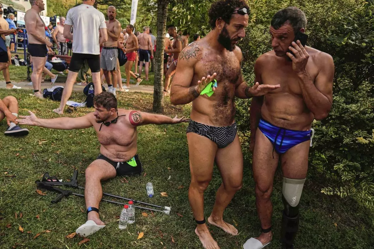Ukrainian war veterans Oleksandr Dashko, from left, Oleh Tserkovnyi and Pavlo Tovstyk, prepare to compete in a 6.5km swimming race across the Bosporus Strait, from the Asian side to the European side, in Istanbul, Turkey, Sunday, Aug. 24, 2025. (AP Photo/Khalil Hamra)