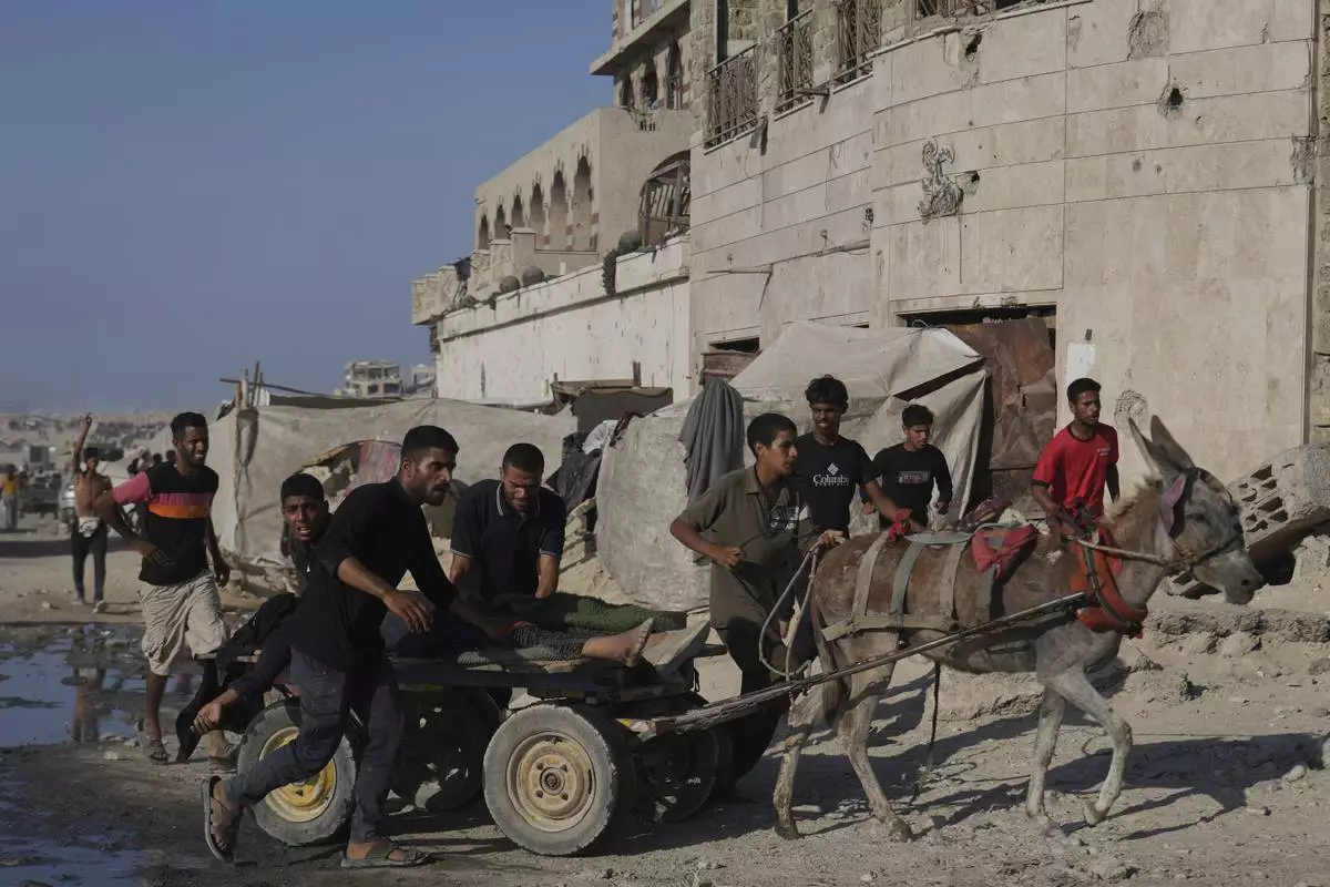 Palestinians transport a woman who was injured while trying to reach a humanitarian aid convoy in the outskirts of Beit Lahiya, as they move on a road in Gaza City, in the Gaza Strip, Sunday, Aug. 24, 2025. (AP Photo/Abdel Kareem Hana)
