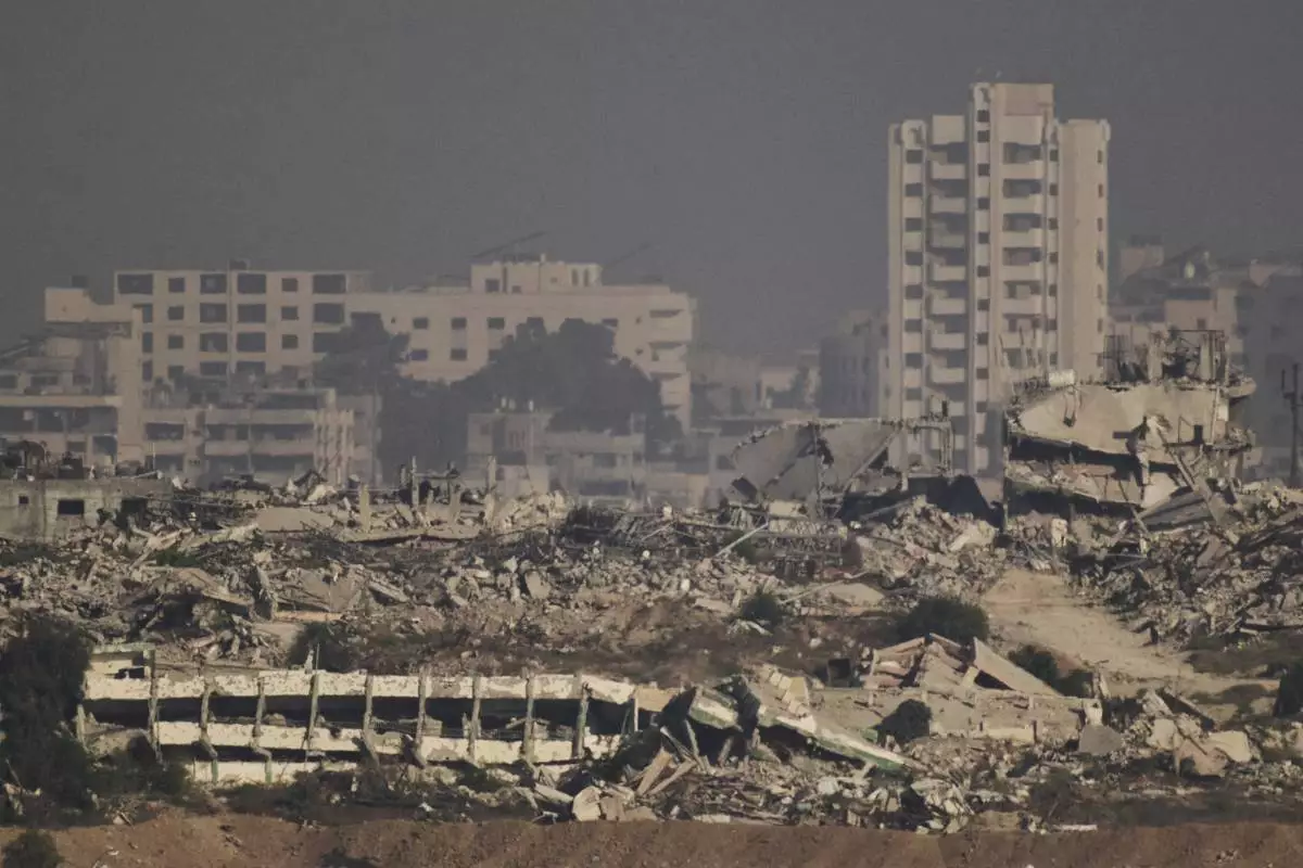 Buildings that were destroyed during Israeli ground and air operations stand in the northern Gaza Strip as seen from southern Israel, Monday, Aug. 25, 2025. (AP Photo/Leo Correa)
