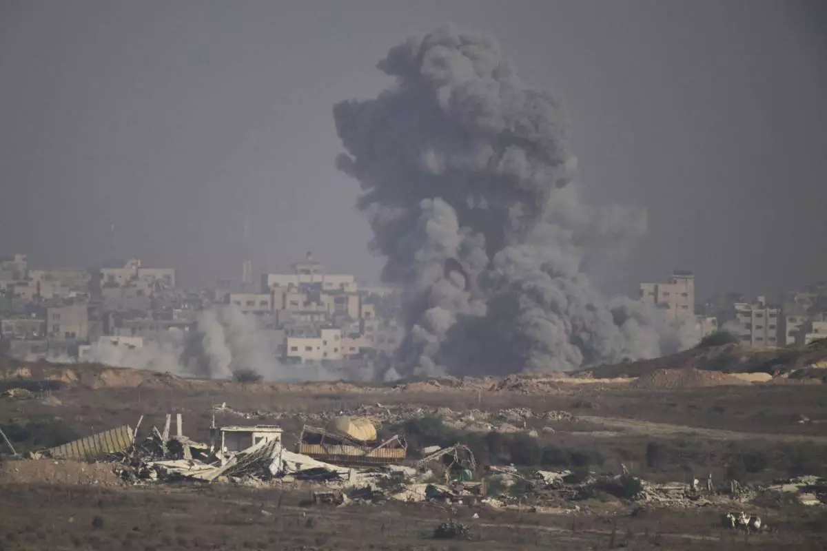 Smoke rises to the sky following an Israeli airstrike in the northern Gaza Strip as seen from southern Israel, Monday, Aug. 25, 2025. (AP Photo/Leo Correa)