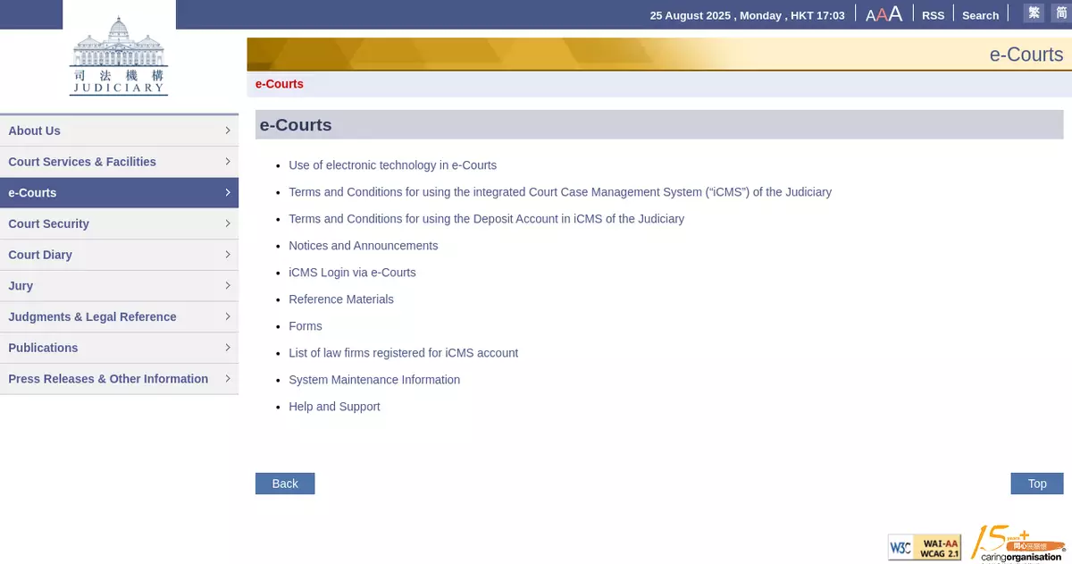 The Judiciary announced that starting from August 29, the integrated Court Case Management System (iCMS) will be extended to cover commercial cases (HCCL), construction and arbitration cases (HCCT), and intellectual property cases (HCIP) in the Court of First Instance of the High Court to allow court users to handle filing and payments electronically.