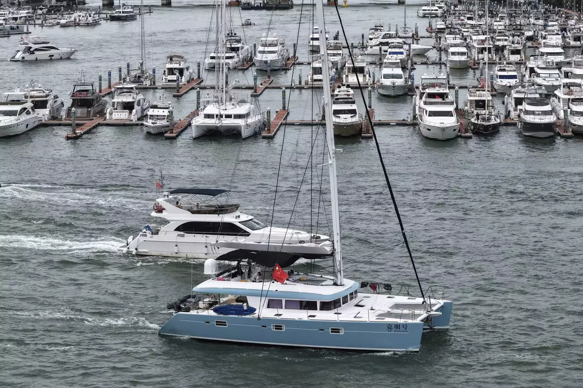In this Aug. 23, 2025, aerial photo released by Xinhua News Agency, yachts return to dock ahead of Typhoon Kajiki in Sanya, southern China's Hainan Province. (Zhao Yingquan/Xinhua via AP)