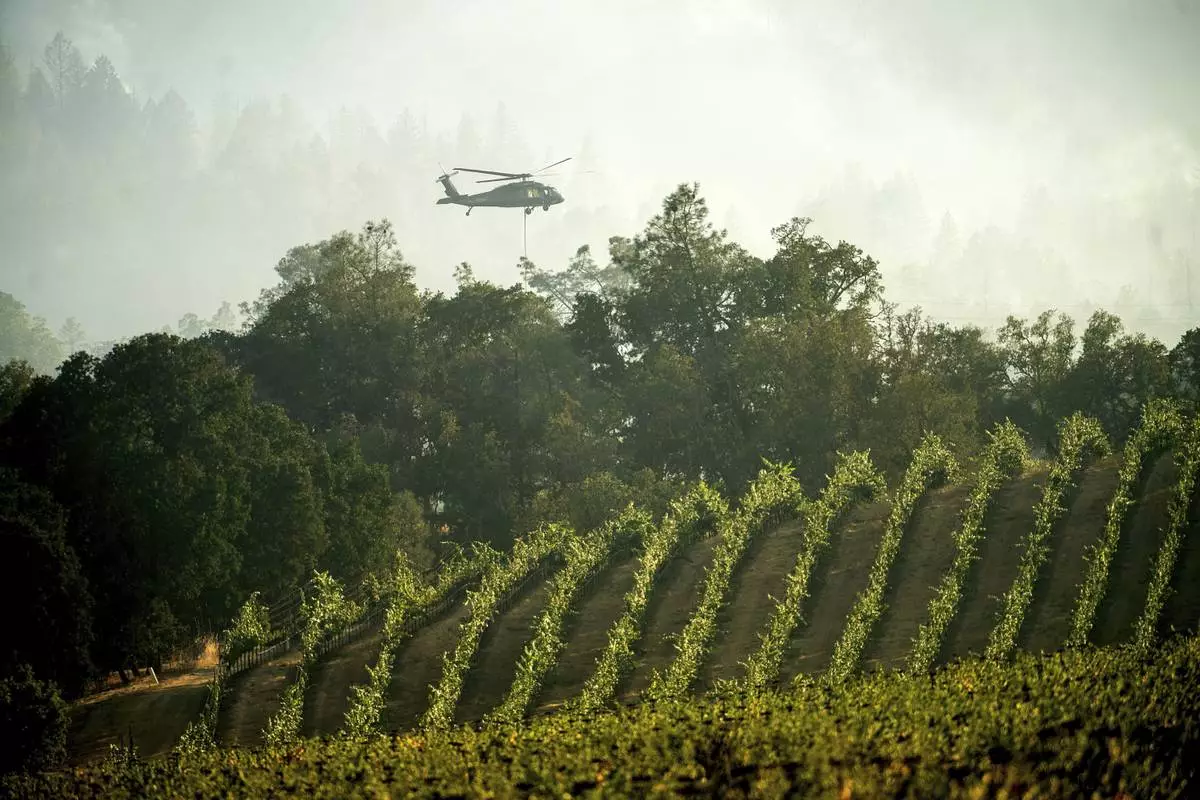 A helicopter flies behind a vineyard while battling the Pickett Fire in the Aetna Springs area of Napa County, Calif., on Sunday, Aug. 24, 2025. (AP Photo/Noah Berger)