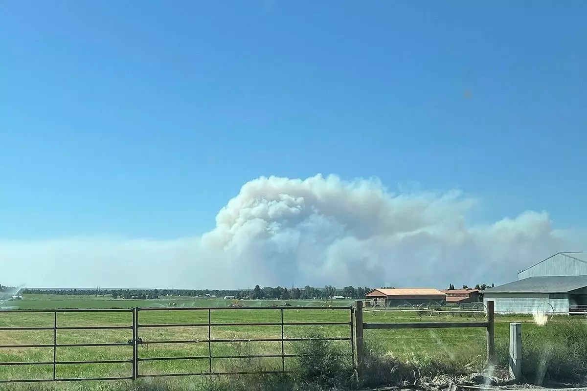 In this photo provided by the Deschutes County Sheriff's Office, smoke plumes from a wildfire in Jefferson County, Ore., Friday, Aug. 22, 2025. (Deschutes County Sheriff's Office via AP)
