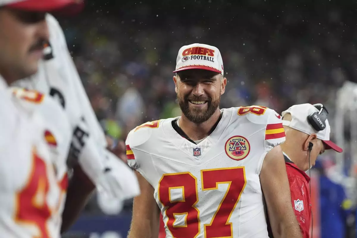 Kansas City Chiefs tight end Travis Kelce (87) reacts on the sideline during the second half of an NFL preseason football game against the Seattle Seahawks, Friday, Aug. 15, 2025, in Seattle. (AP Photo/Lindsey Wasson)