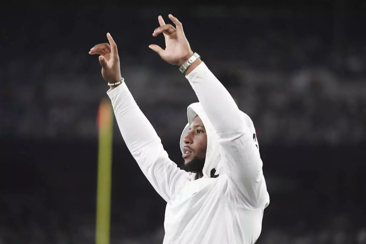 Philadelphia Eagles running back Saquon Barkley reacts in the second half of a preseason NFL football game against the New York Jets in East Rutherford, N.J., Friday, Aug. 22, 2025. (AP Photo/Frank Franklin)
