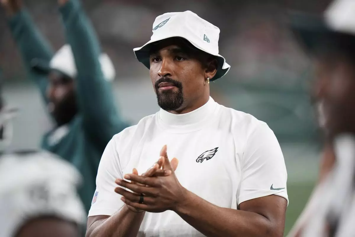 Philadelphia Eagles quarterback Jalen Hurts watches from the sideline in the second half of a preseason NFL football game against the New York Jets in East Rutherford, N.J., Friday, Aug. 22, 2025. (AP Photo/Frank Franklin)