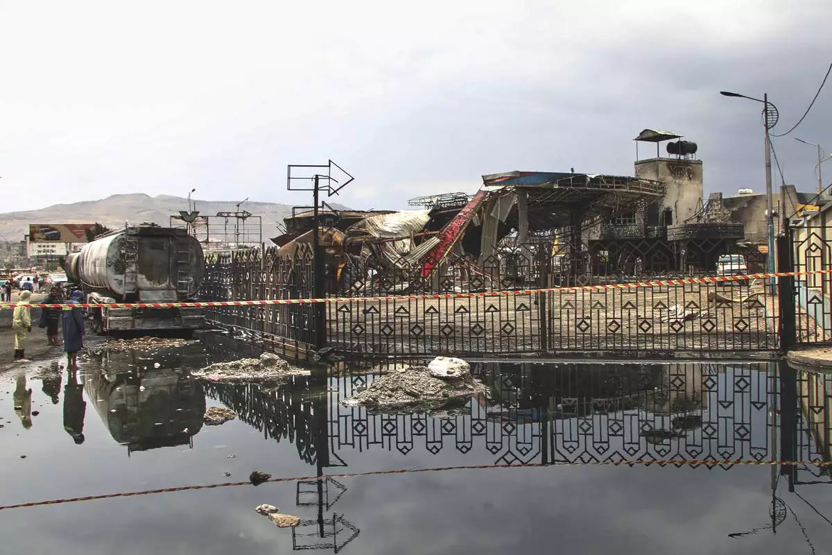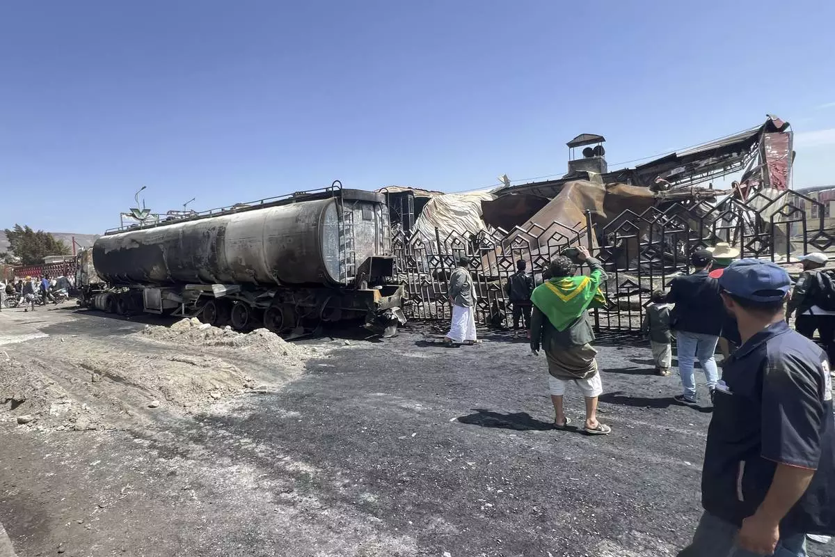 People inspect a damaged petrol station hit in Israeli airstrikes on Sunday, in Sanaa, Yemen, Monday, Aug. 25, 2025. (AP Photo)