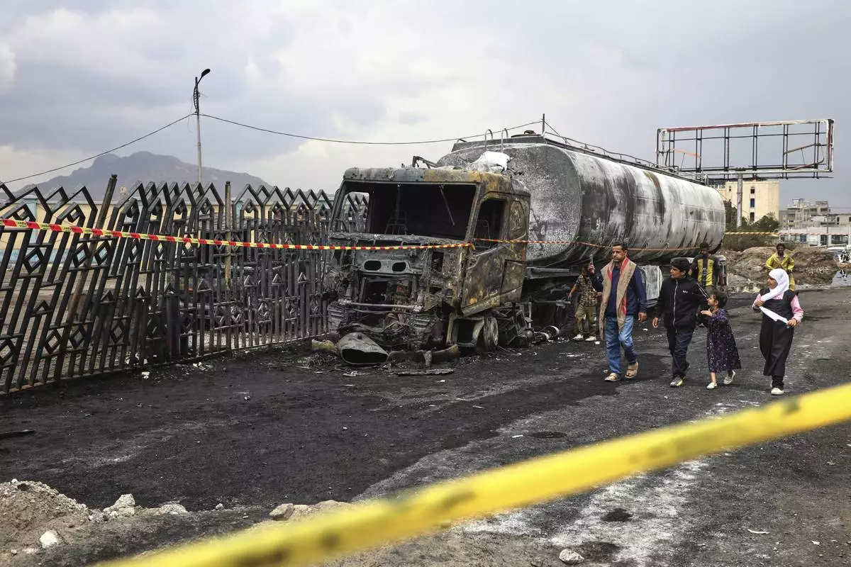People walk past the wreckage of a fuel truck destroyed in Israeli airstrikes on Sunday, in Sanaa, Yemen, Monday, Aug. 25, 2025. (AP Photo)