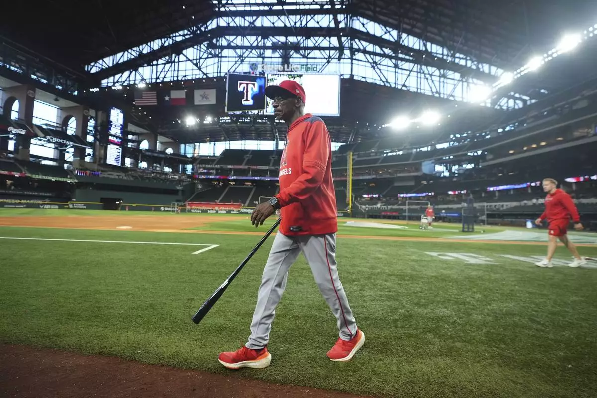 Los Angeles Angels manager Ron Washington walks on the field during batting practice before a baseball game against the Texas Rangers, Monday, Aug. 25, 2025, in Arlington, Texas. (AP Photo/LM Otero)