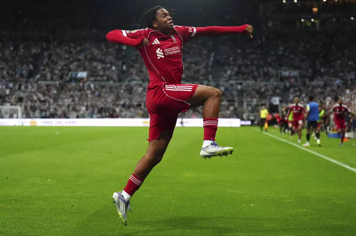 Liverpool's Rio Ngumoha celebrates after scoring his side's third goal during the English Premier League soccer match between Liverpool and Newcastle United at St James' Park, Newcastle, England, Monday Aug. 25, 2025. (Owen Humphreys/PA via AP)