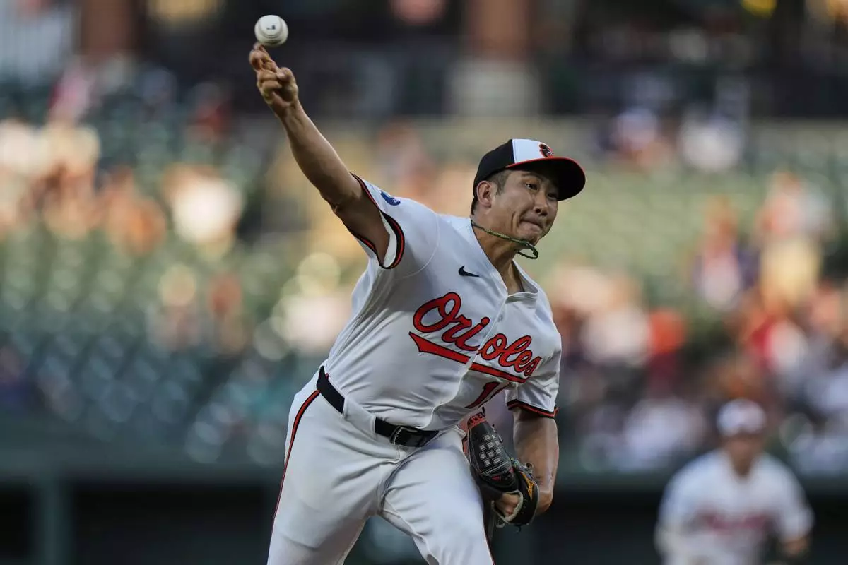 Baltimore Orioles starting pitcher Tomoyuki Sugano delivers during the second inning of a baseball game against the Boston Red Sox, Monday, Aug. 25, 2025, in Baltimore. (AP Photo/Stephanie Scarbrough)