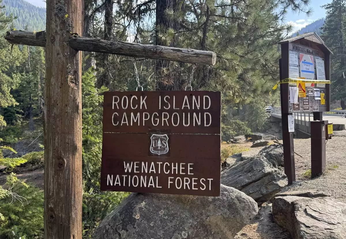 This photo provided by FBI Seattle shows the entrance to Rock Island Campground where multiple law enforcement agencies are participating in the search for Travis Decker, who was charged with murder and kidnapping, near Leavenworth, Wa. on Monday, August. 25, 2025. (FBI via AP)
