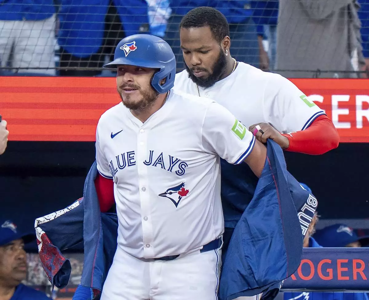 Toronto Blue Jays designated hitter Vladimir Guerrero Jr., right, puts the home run jacket on teammate Alejandro Kirk, left, after Kirk's two-run home run against the Minnesota Twins in first-inning baseball game action in Toronto, Monday, Aug. 25, 2025. (Frank Gunn/The Canadian Press via AP)