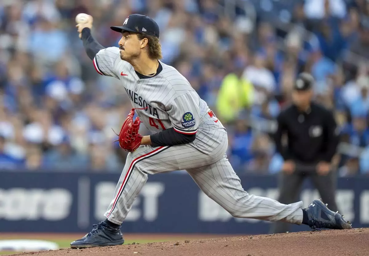 Minnesota Twins starting pitcher Joe Ryan throws in first-inning baseball game action against the Toronto Blue Jays in Toronto, Monday, Aug. 25, 2025. (Frank Gunn/The Canadian Press via AP)