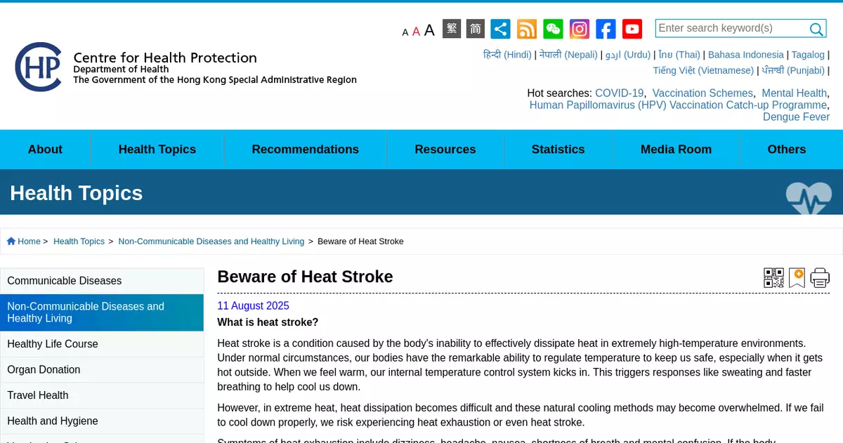 "Heat stroke is one of the most common health risks in hot weather. Over the past five years, there have been over 200 hospital admissions due to heat stroke each year in Hong Kong, with two to five fatal cases occurring mainly during the summer months from May to September. Vulnerable groups are more susceptible to heat stroke. Symptoms include dizziness, headache, nausea, shortness of breath or confusion. In severe cases, patients may suffer from convulsions or become unconscious, which can be life-threatening if they are not cooled down and resuscitated in a timely manner," a spokesman for the CHP said.